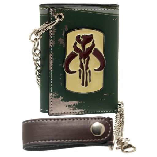 Portefeuille - Star Wars - Logo de Boba Fett et L'Emblème des Mandalorians en Métal Vert et Gris Faux Cuir avec Chaine